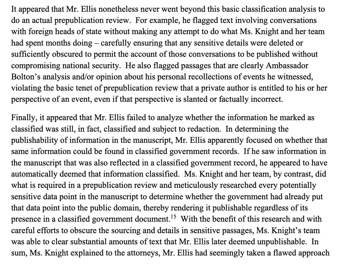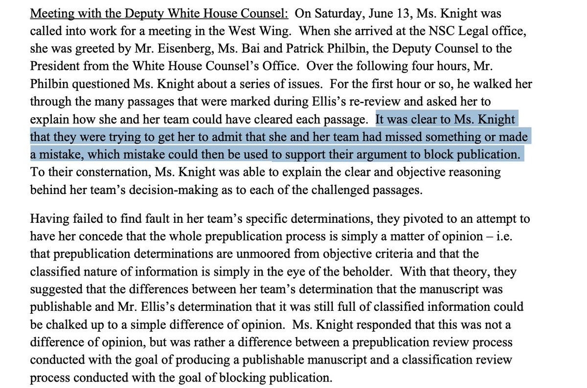 The filing is most unsparing toward Michael Ellis (one of the officials Dems tried to interview during impeachment but who didn't appear). Knight says he fundamentally twisted the process to claim certain passages were classified that were not. politico.com/f/?id=00000174…
