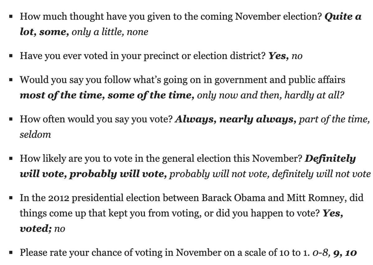 In 2014, about 16% of people that Pew deemed as likely voters — people who said they were nearly certain to vote and met various other fairly stringent criteria — did not wind up voting.