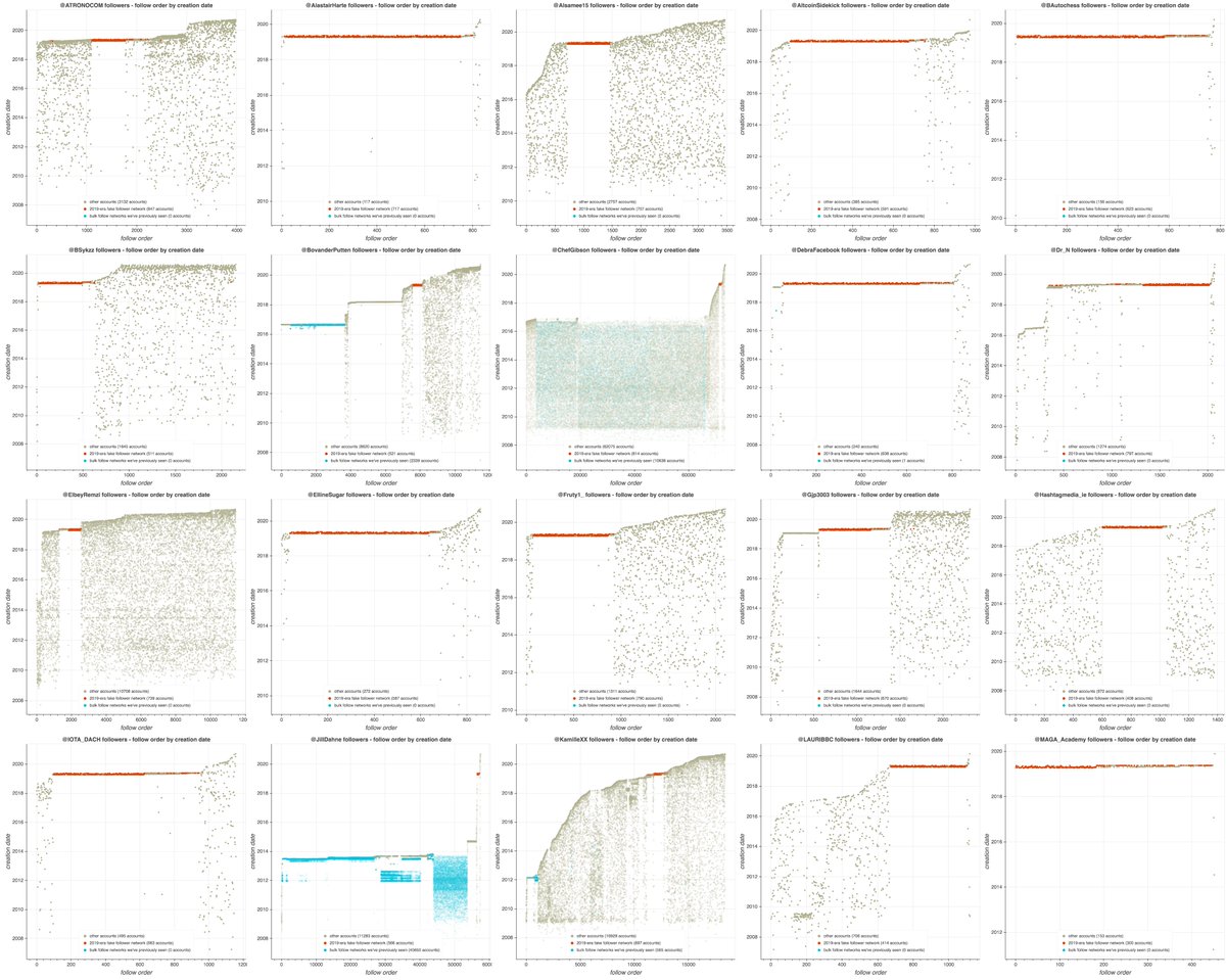 Some of the accounts retweeted by the @sendthetrend botnet also have fake followers. We took a quick look at a network of accounts created in 2019 that followed @dk_alsabah en masse.