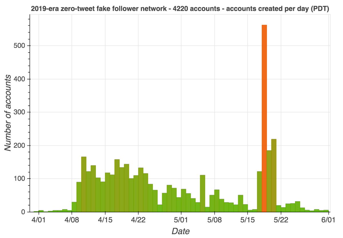 We found 4220 accounts that we believe are part of this fake follower botnet, all created between March 31st and May 31st, 2020. Since none of these accounts has ever tweeted, there's obviously not much to analyze in terms of content.