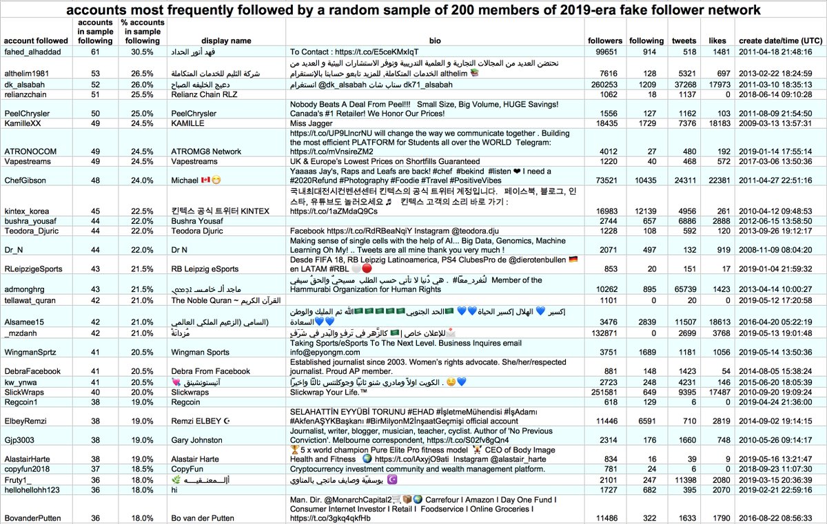 Who do the accounts in this botnet follow? A variety of business/promotional accounts that tweet in a variety of languages, mostly English and Arabic. Many are smaller accounts that got most of their followers from this fake follower network.