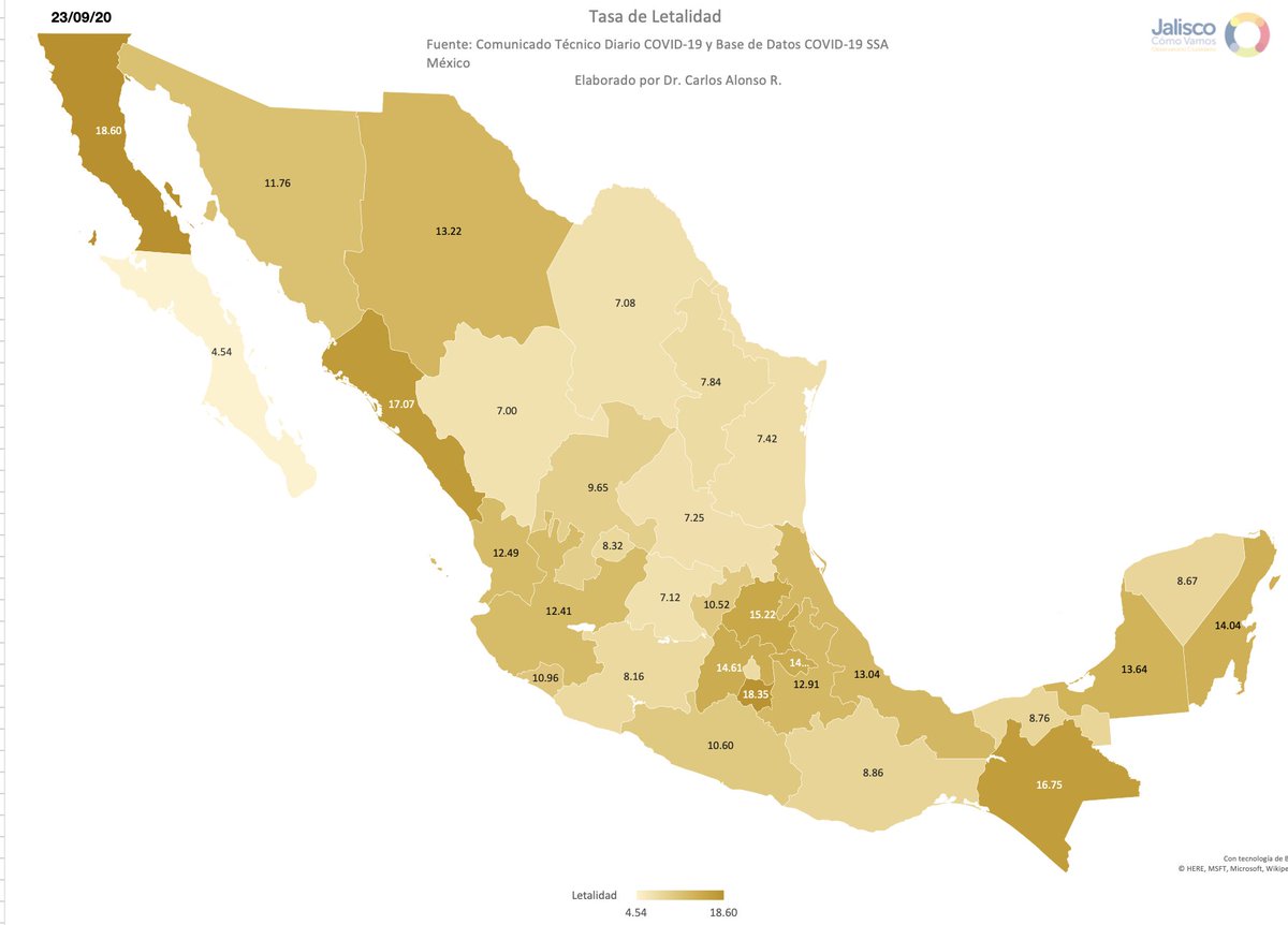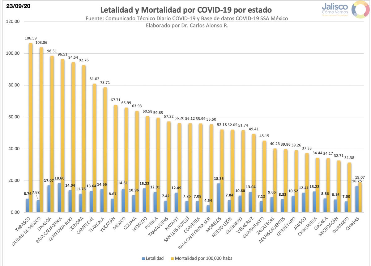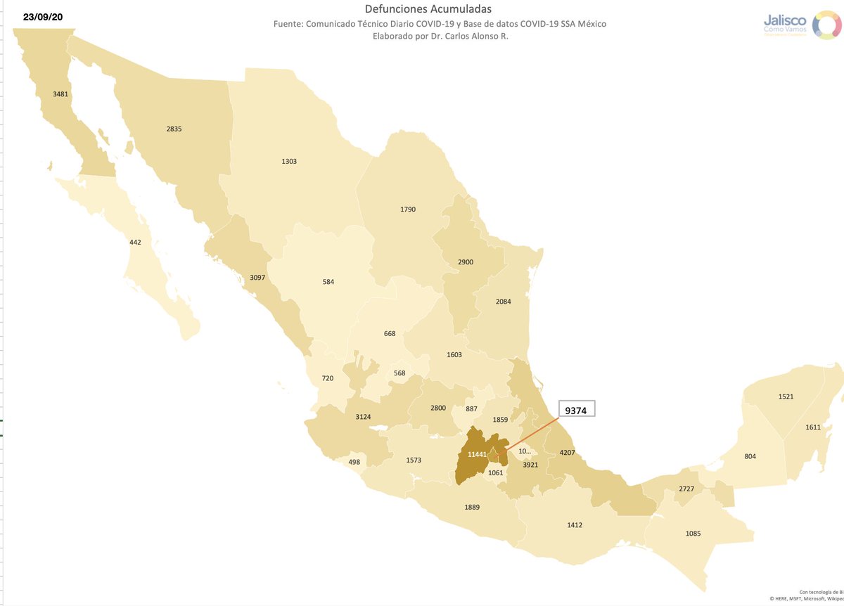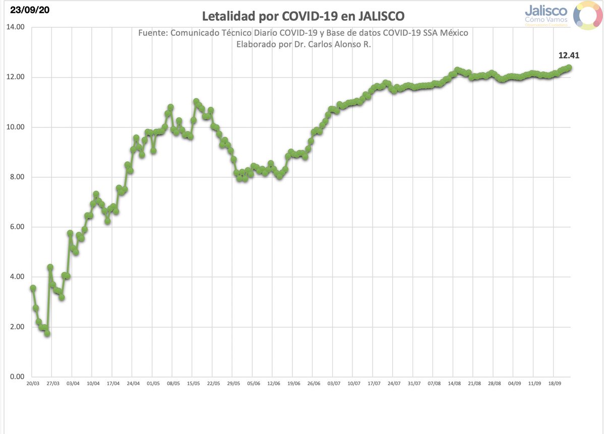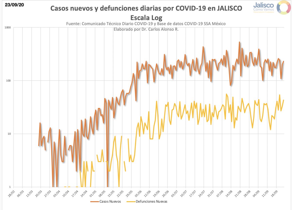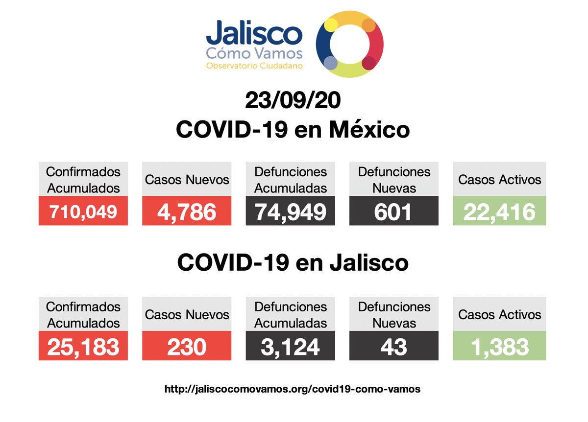 Jalisco: 25,183 confirmados, 3,124 defunciones y 1,383 casos activos. 230 casos y 43 Defunciones más que ayer.