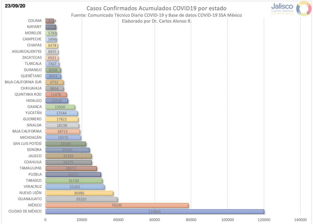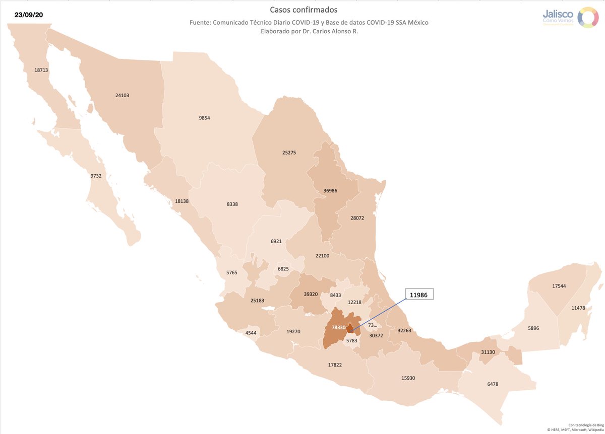 Jalisco: 44,560 confirmados, 5,100 defunciones y 2,292 casos activos. 336 casos y 27 Defunciones más que ayer.