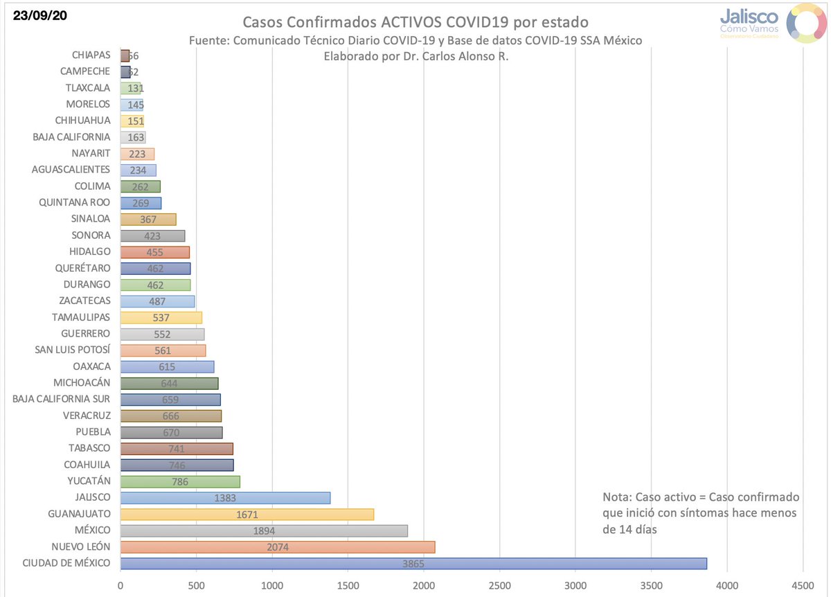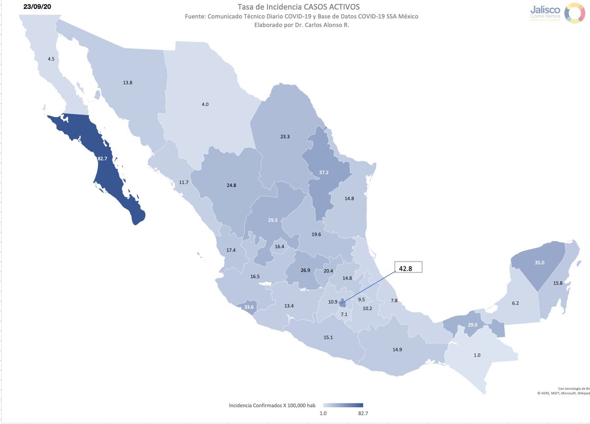 Jalisco se encuentra en el 5to lugar por casos activos a nivel nacional.