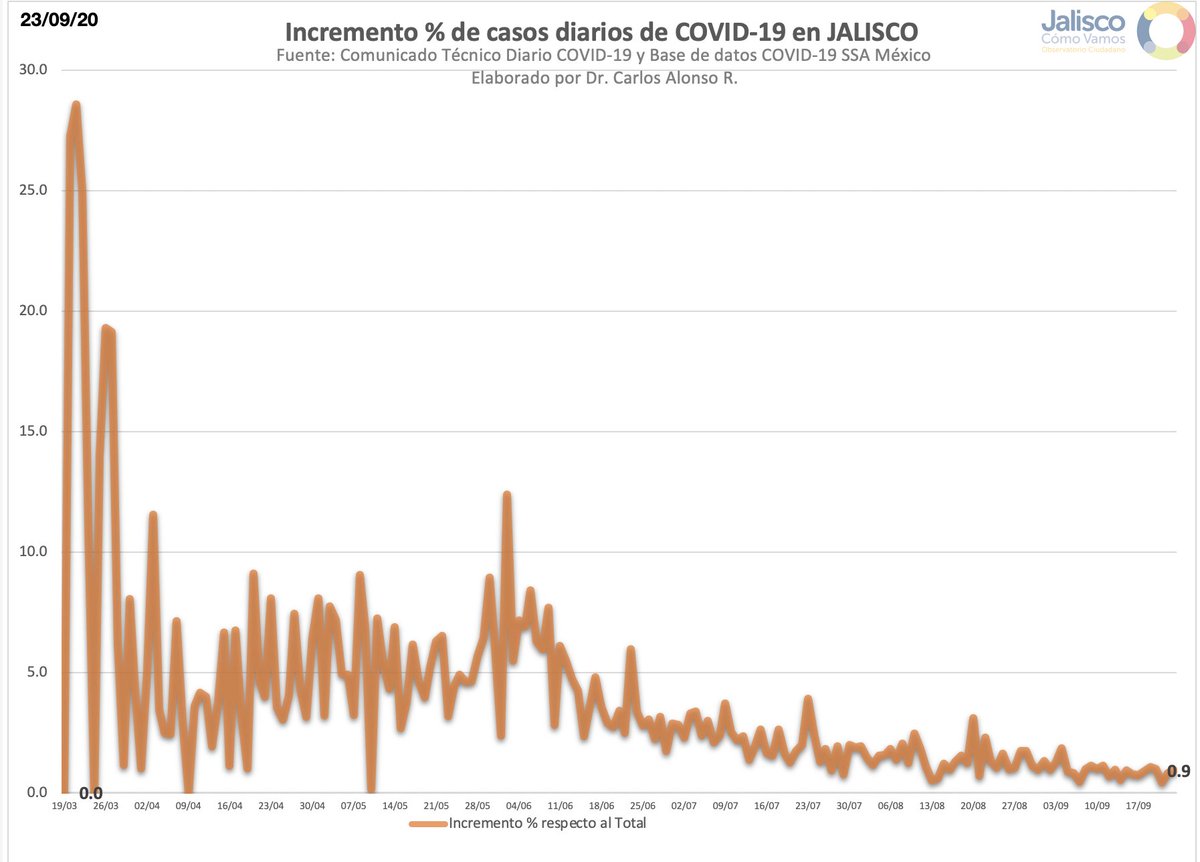 El crecimiento % diario en Jalisco en relación al total de casos del día anterior es de 0.9 con un promedio de crecimiento de 0.8 % en los últimos 7 días.