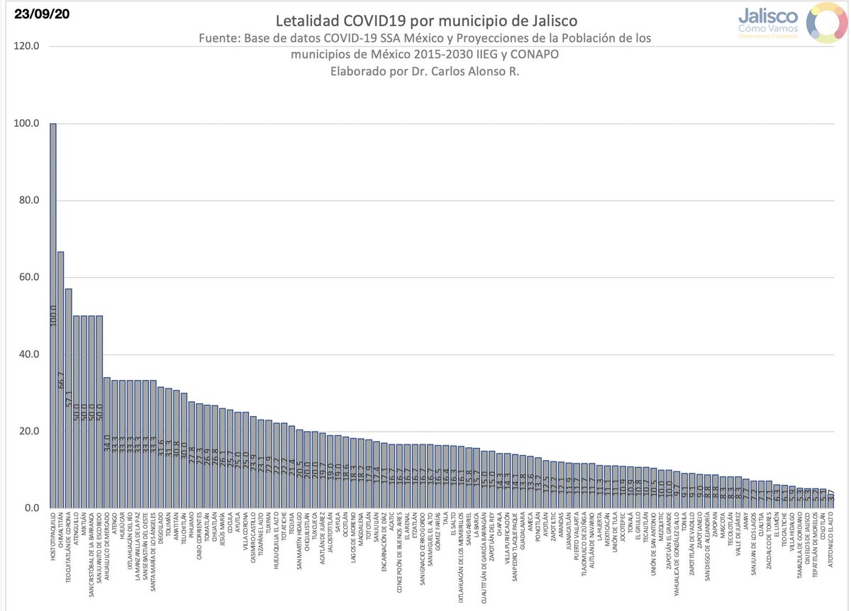 Aquí podemos observar las defunciones y letalidad por municipio en el estado de Jalisco.