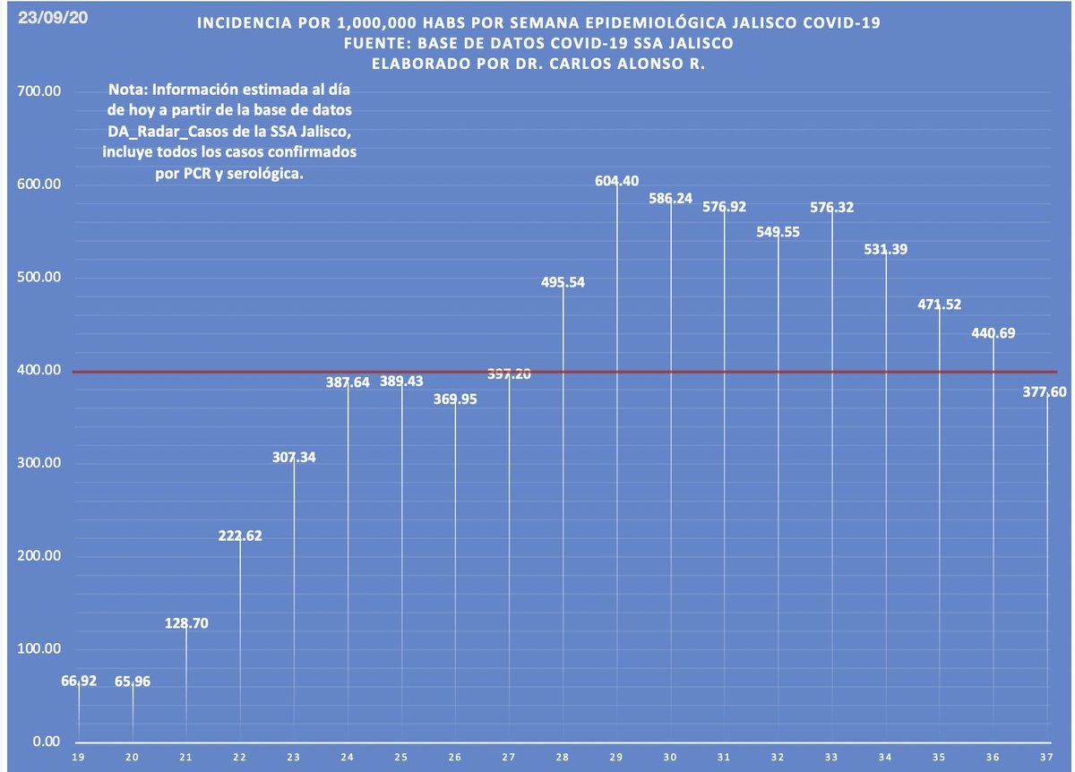 Por último la actualización diaria de la base de datos de @saludjalisco con el indicador de incidencia por millón de habitantes por semana y casos confirmados diarios por tipo de prueba al día de hoy.