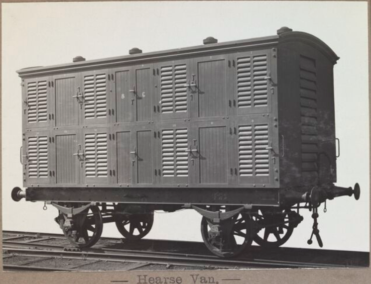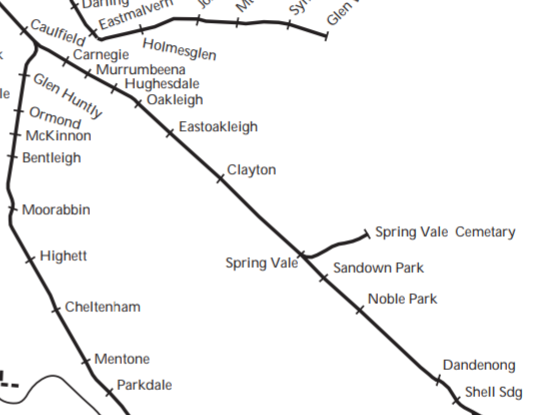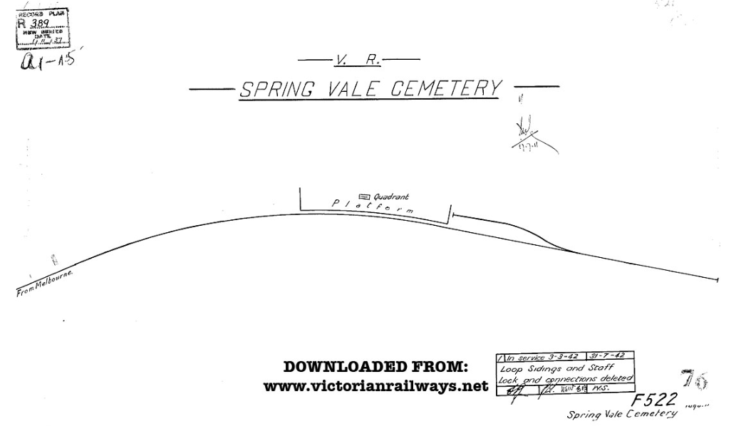 Spring Vale Cemetery railway branched from the Dandenong line just past (down) Spring Vale station. Was ~ 1.2 miles (1.9 km) in length. Opened 1904 closed officially 1951. Sparked 1922.
