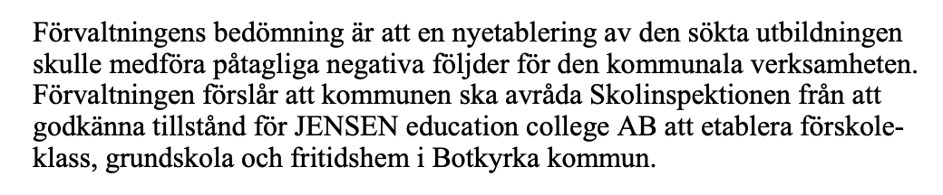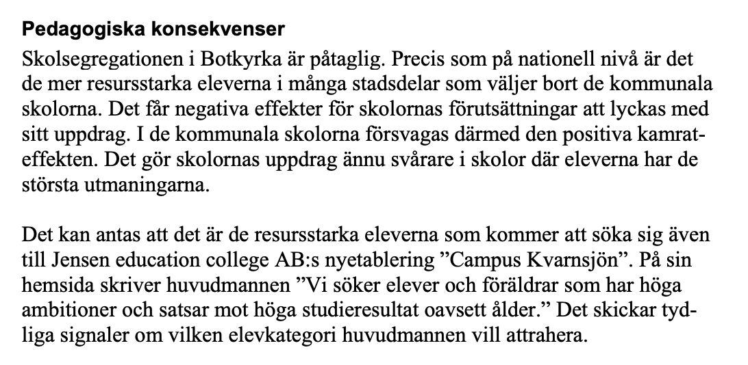 Förvaltningen konstaterar vidare att det finns stor skolsegregation i Botkyrka, att resursstarka elever väljer bort vissa områden, att den kommunala skolans möjligheter försämras och att JENSEN riktar sig till just de resursstarka eleverna.