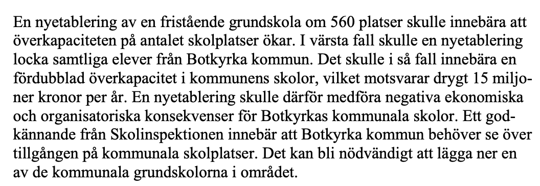 2. Man konstaterar vidare att 22 % av alla elever i Botkyrka väljer fristående grundskola redan idag och att detta får ekonomiska konsekvenser för kommunen. Detta har jag visat från andra kommuner, ett antal gånger. Är man insatt vet man att det är så det är.