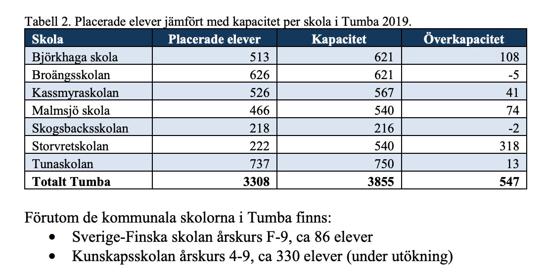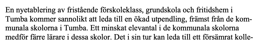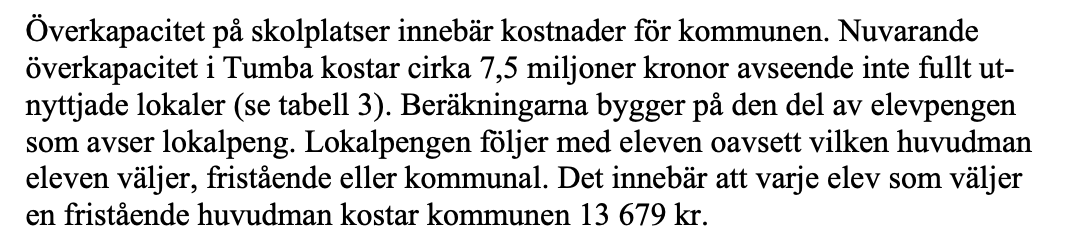 3. I Tumba, där JENSEN ska etablera sig, finns redan överkapacitet i kommunens skolor på 547 elever. Det här är tomma stolar i kommunens klassrum som gör att kommunens genomsnittliga lokalkostnad ökar. Friskolor ska få den genomsnittliga lokalkostnaden så ökar den ökar deras peng