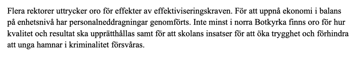14. Men det går inte så bra. Rektorer är oroliga över effektiviseringskravens konsekvenser. Personalneddragningar har genomförts. Och i norr - där problemen är jättestora - ser man att skolans insatser för att få barn att inte bli kriminella försvåras.