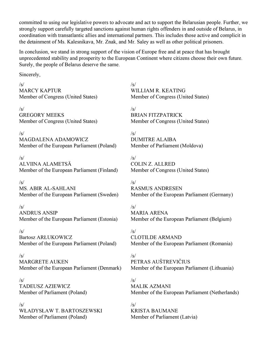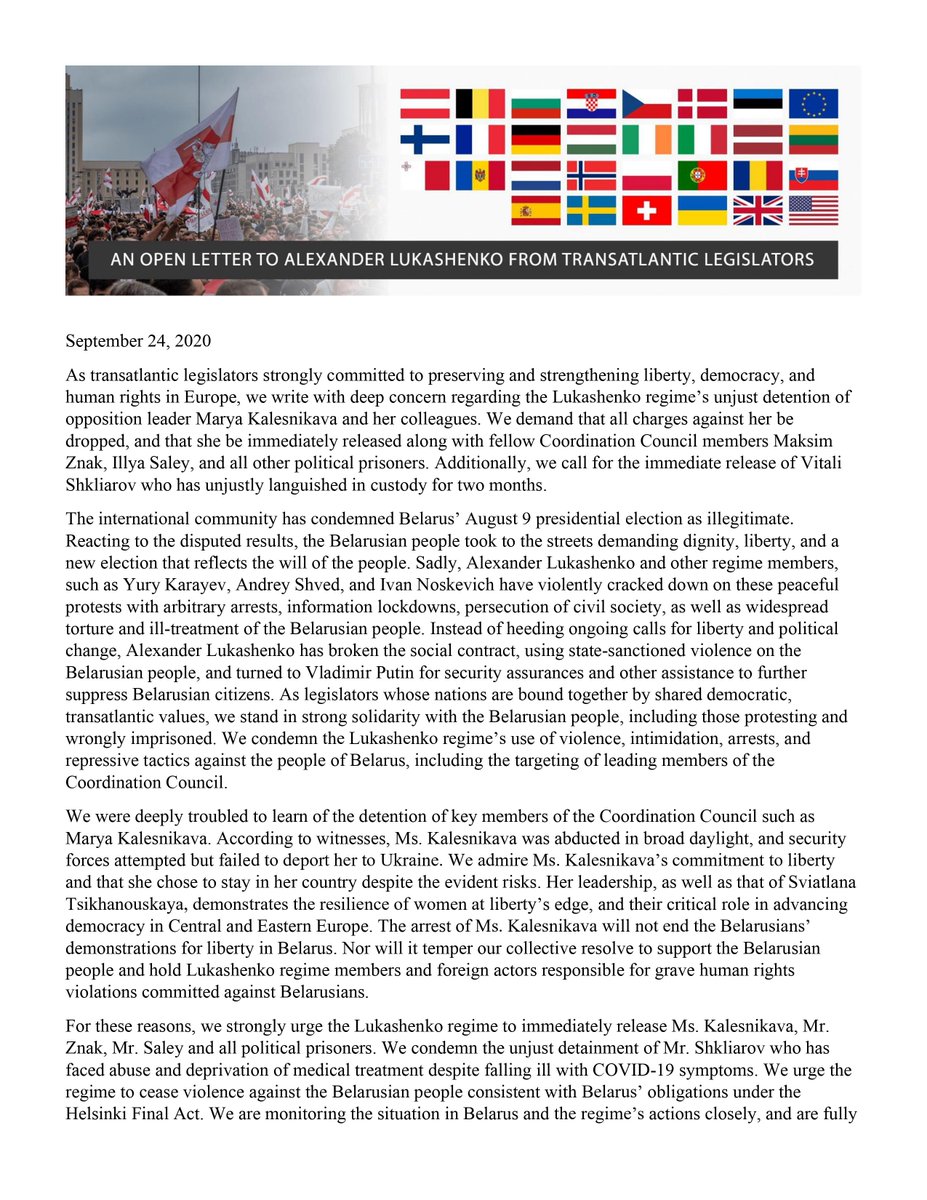 Today, I co-led 273 transatlantic legislators from 29 countries in a letter to the illegitimate President of #Belarus Alexander Lukashenko demanding the immediate release of opposition leader Marya Kalesnikava and all other political prisoners.