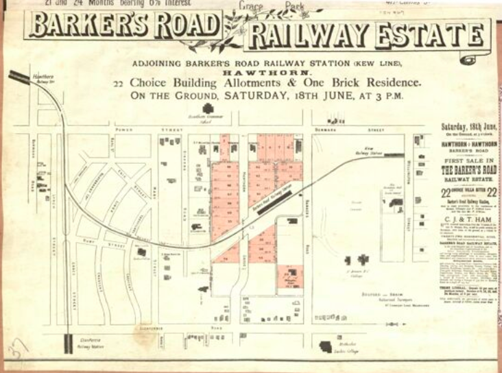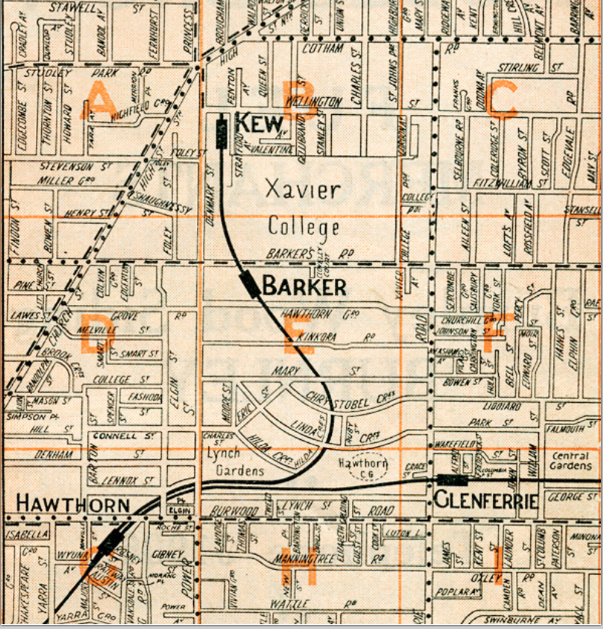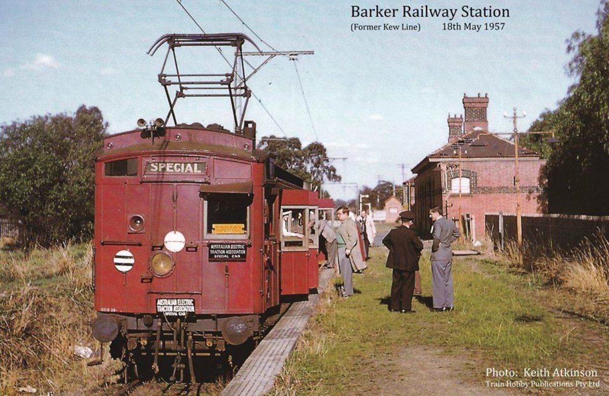 The Kew line branched from Hawthorn, station at Barker and then Kew. Single line 1.5 miles long. Opened 1887, officially closed 1957. Sparked 1922.