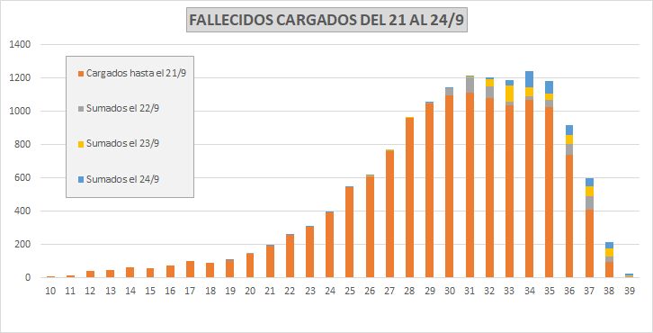 Fallecidos cargados hasta el 21/9, y los sumados el 22, 23 y 24/9 según semana de inicio de síntoma. Se han venido cargando atrasados desde la semana 29, avanzando cada día. El 22 semana 29 y 30, ayer 32 y 33, hoy ya fue la mayoría de las semanas 34 en adelante.
