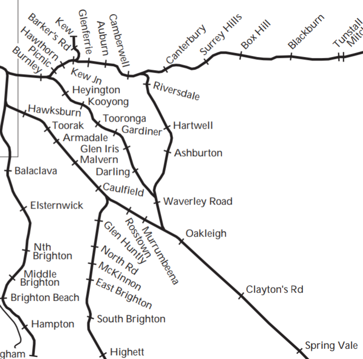 The former outer circle line, Black Bridge, and the old line from Darling can be seen. Waverley Road station area can be discerned. The Glen Waverley line goes across west to east.