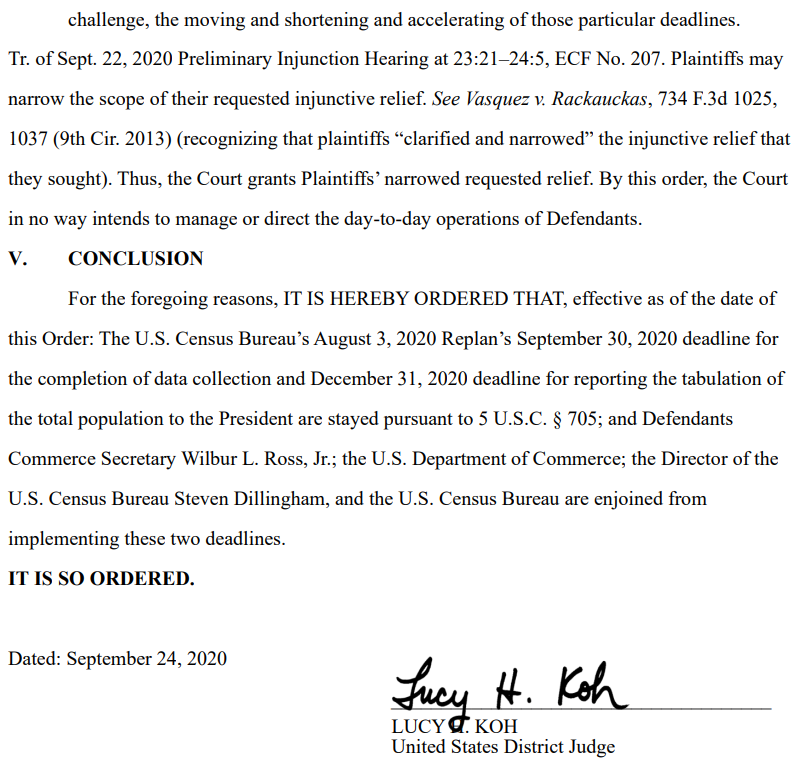3. Here's the PDF of the order by U.S. District Judge Lucy Koh that extends #2020Census counting through Oct. 31 (I deleted an earlier tweet that incorrectly said Oct. 21):