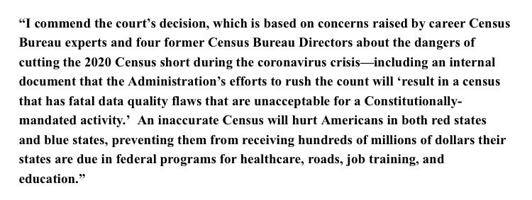 5. @RepMaloney (D-NY), chair of House @OversightDems, commends Judge Koh’s ruling, noting that an inaccurate #2020Census “will hurt Americans in both red states and blue states.” I commend the court’s decision, which is based on concerns