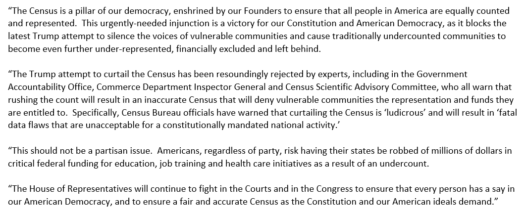 @RepMaloney @OversightDems 6. @SpeakerPelosi calls Judge Koh's order that extends #2020Census counting through Oct. 31 "a victory for our Constitution & American Democracy" & that the "House of Representatives will continue to fight in the Courts and in the Congress...to ensure a fair and accurate Census." The Census is a pillar of our democracy, enshrined by our Fo
