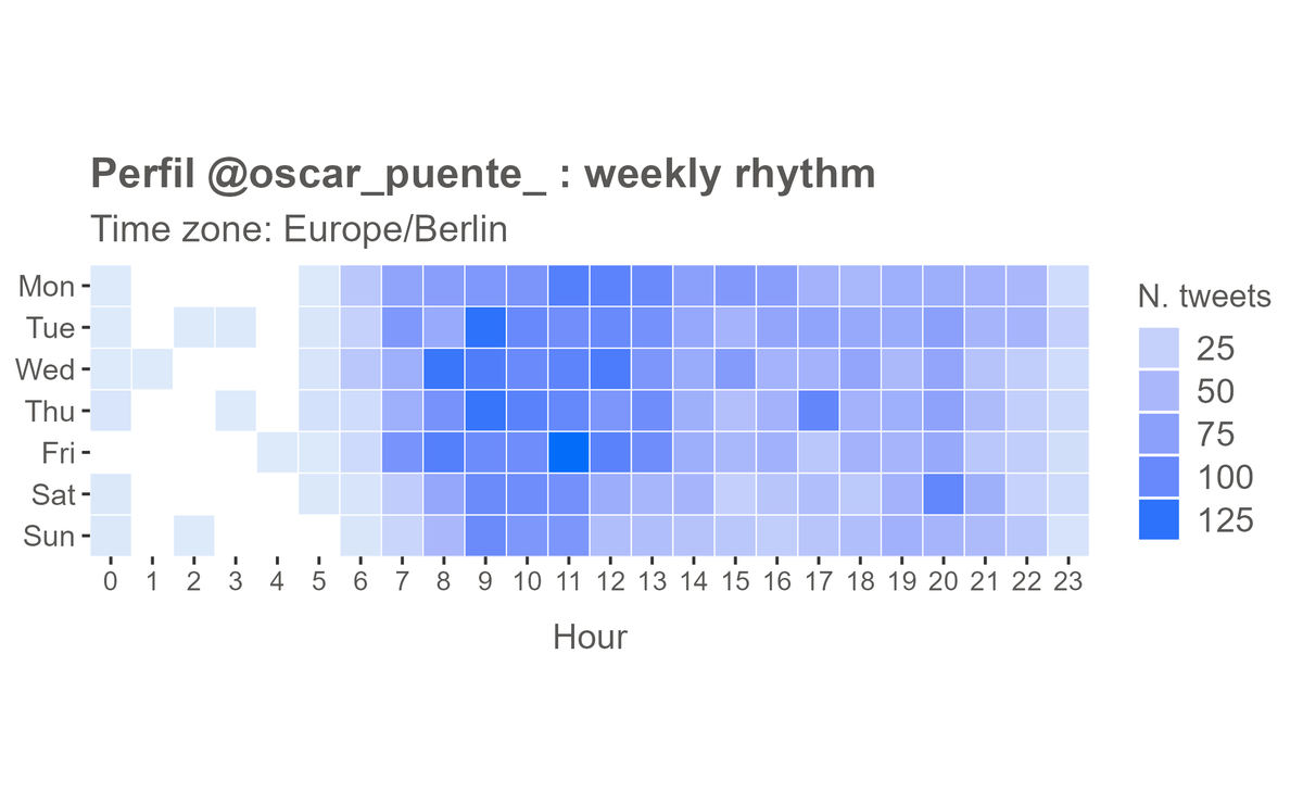 3⃣ Semanalmente es más activo en días laborables que en fines de semana. Los martes destaca especialmente: no sé a qué hora es el Consejo de Ministros, pero a las 9 de la mañana su actividad en Twitter se dispara.