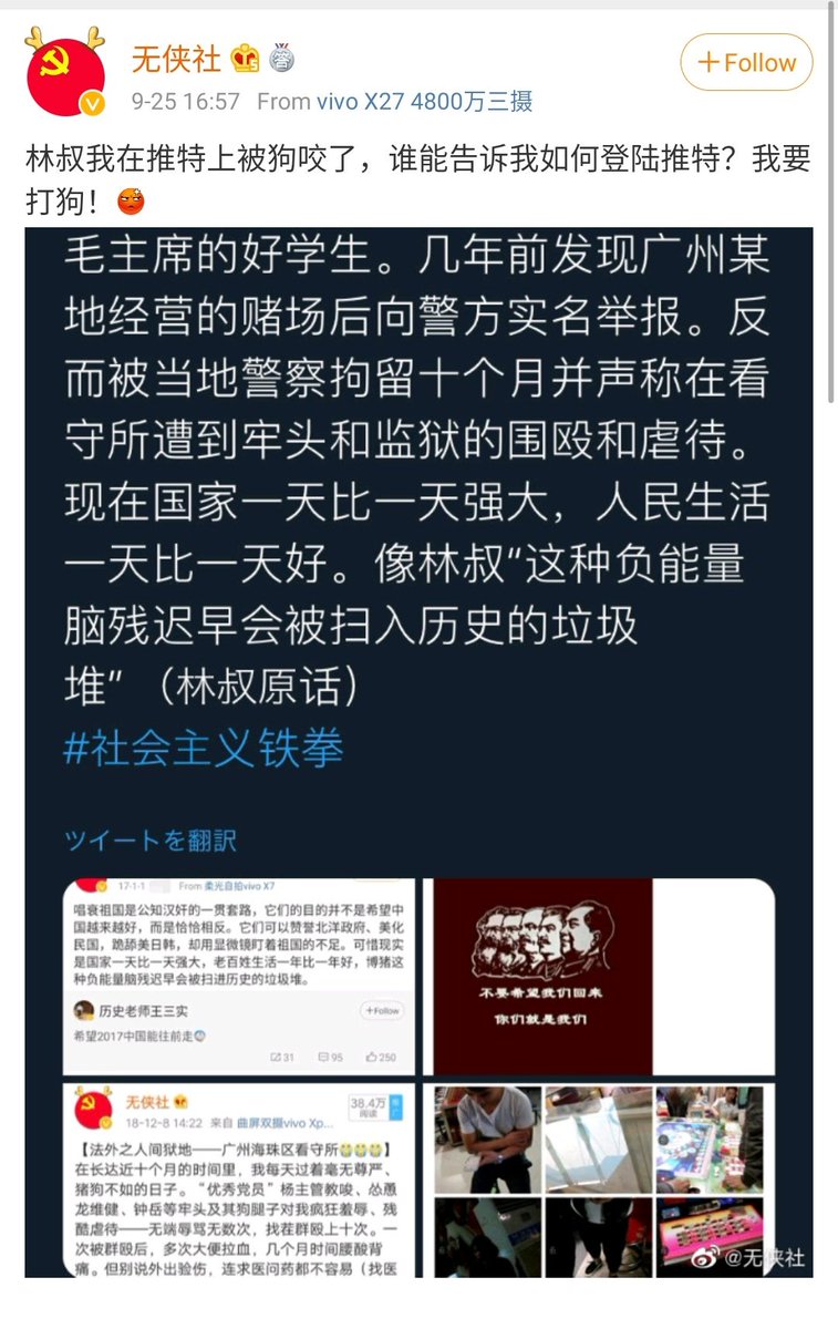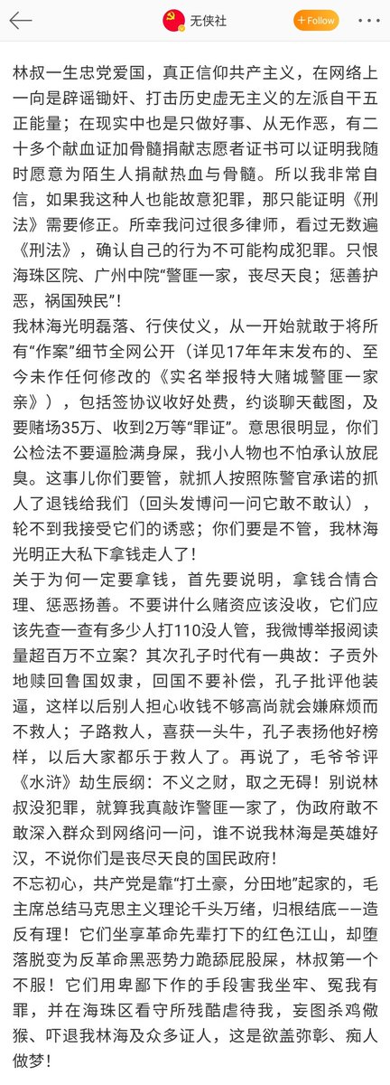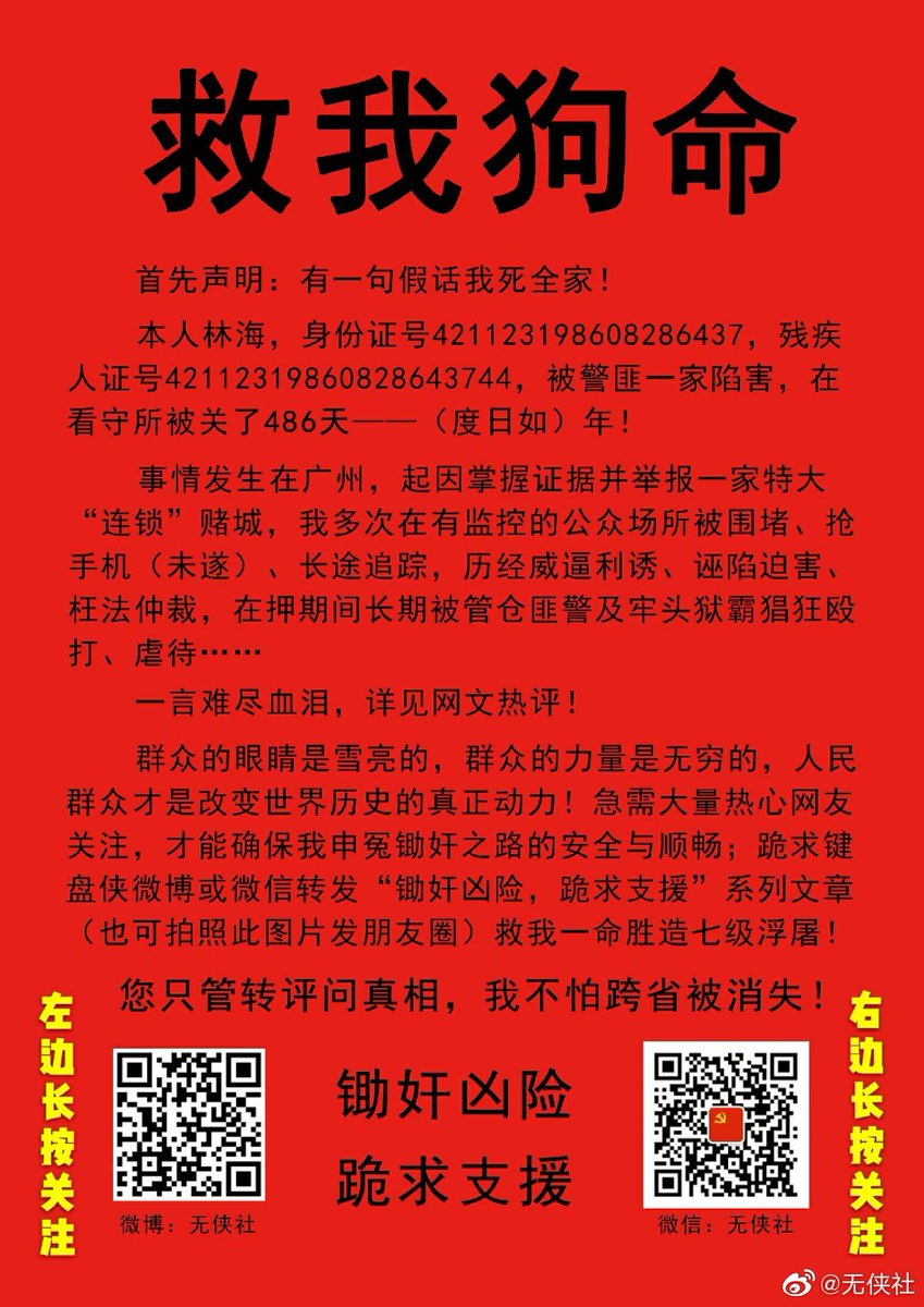 林叔是一个忠诚的共产主义信奉者和毛主席的好学生。几年前发现广州某地经营的赌场后向警方实名举报。反而被当地警察拘留十个月并声称在看守所遭到牢头和监狱的围殴和虐待。