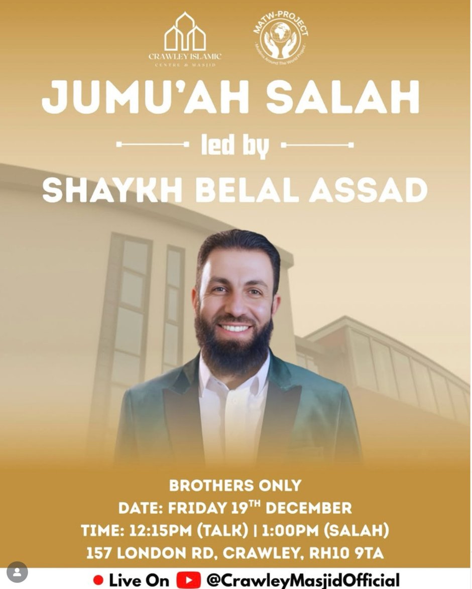 This Friday, the Crawley Islamic Centre, an extremist mosque aligned with the terrorist support group Cage, will welcome a special guest - the Australian preacher Belal Assad.