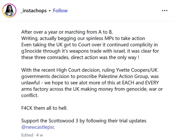 Chopra is no improvement. She backs Mildenhall wholeheartedly. As Mildenhall went on trial, she wrote: “we hope to see a lot more of this at EACH and EVERY arms factory across the UK making money from genocide, war or conflict. F4CK them all to hell.” 2/10