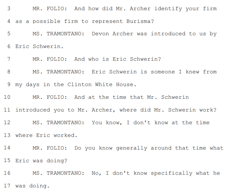 2/ Tramontano was very obtuse in testimony to Senate Judiciary on Schwerin's background, saying she knew him from Clinton WH days and didn't know where he was working at time of introduction to Burisma or even what he was doing. Suspicious obtuseness for a big-time networker.