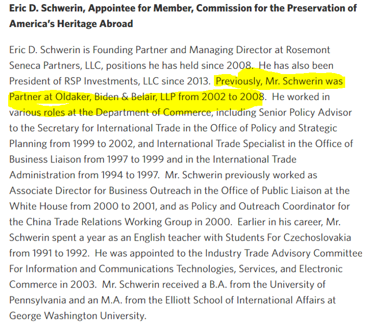 5/ Tramontano's feigned obtuseness is even more laughable. Schwerin bio in Obama admin announcement stated that, from 2002-2008, he had been partner at Oldaker, **Biden** & Belair - Hunter's lobbying operation prior to Obama admin. So Schwerin had been Hunter's sidekick for years