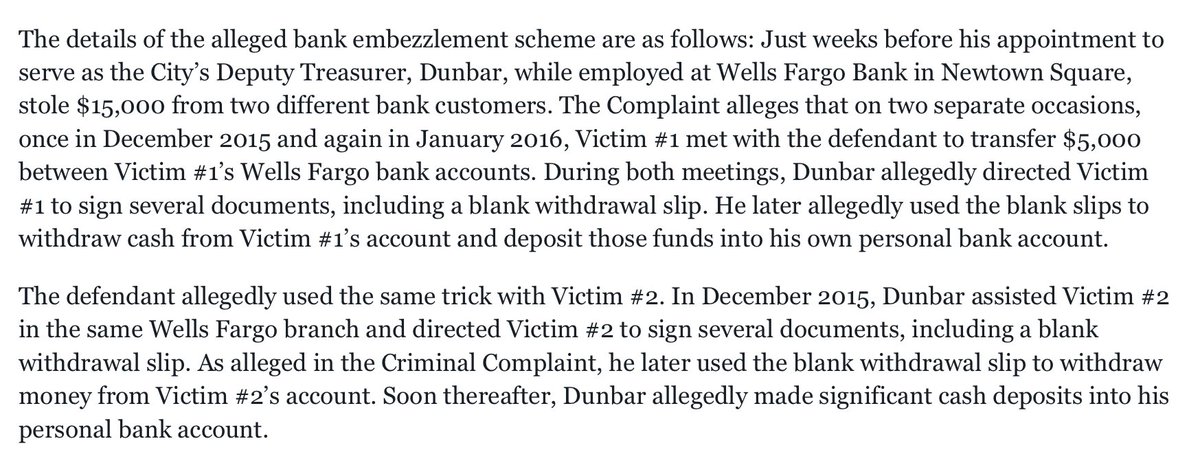 Shortly before he was appointed as Philly’s Deputy Treasurer, Dunbar worked for Wells Fargo. While there, he stole $15,000 from 2 bank customers.