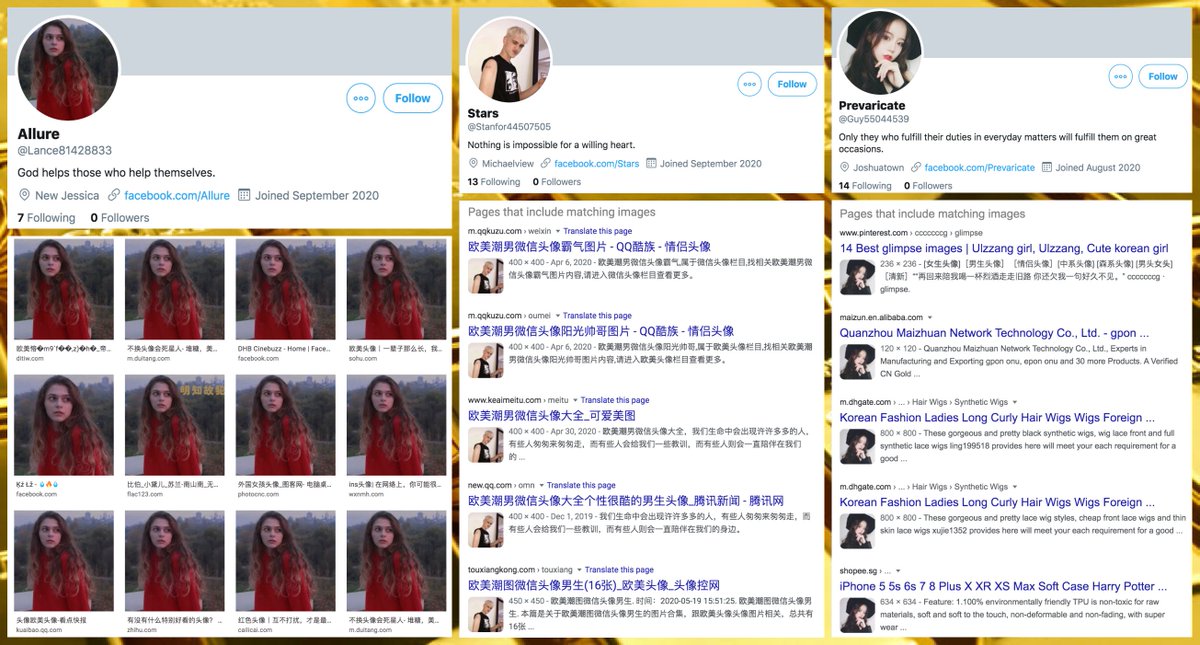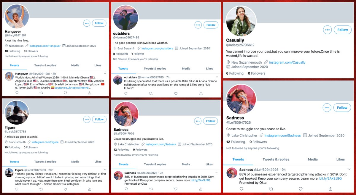 As is common with spammy networks, these accounts use stolen profile pics, and in some cases use the same pic on more than one account (@Kenneth16730717 and @Lance81428833, for example).