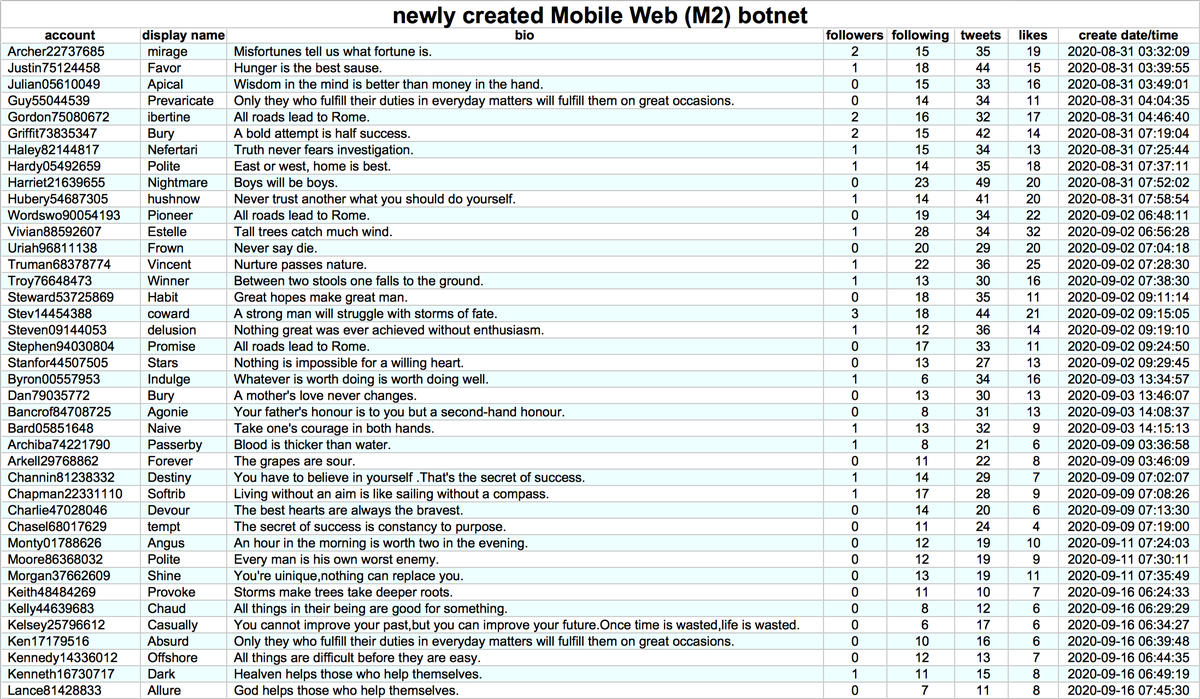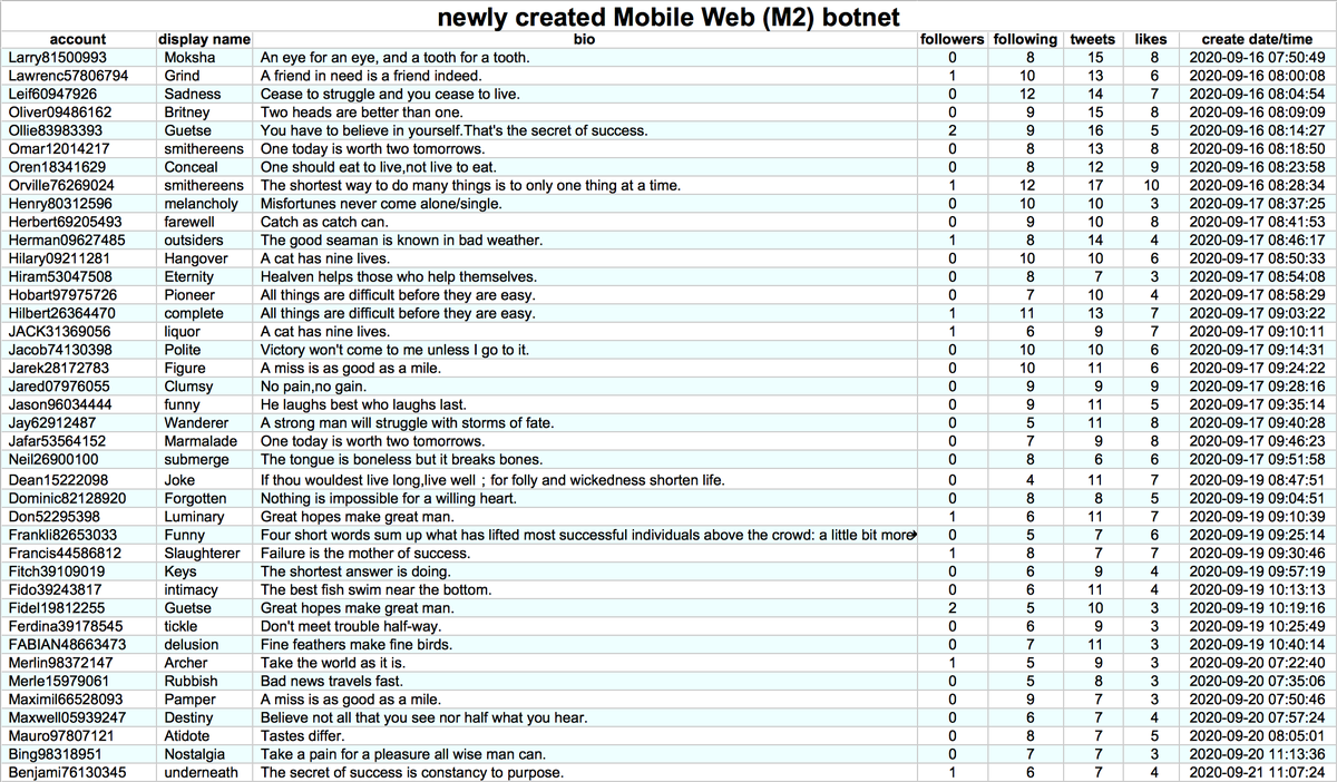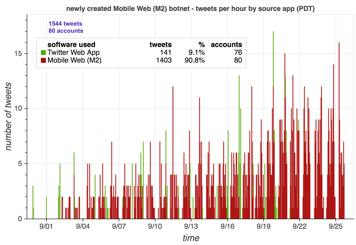 We found a total of 80 accounts that fit the pattern, created between August 31st and September 21st, 2020. All are low volume and mostly tweet via Mobile Web (M2), with occasional tweets sent via Twitter Web App.