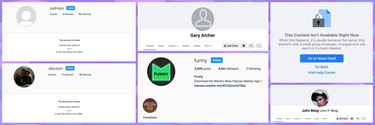 There doesn't appear to be any particular pattern to the content of Instagram and Facebook pages. Some are empty or don't exist, some are random small accounts, and some are major influencers.