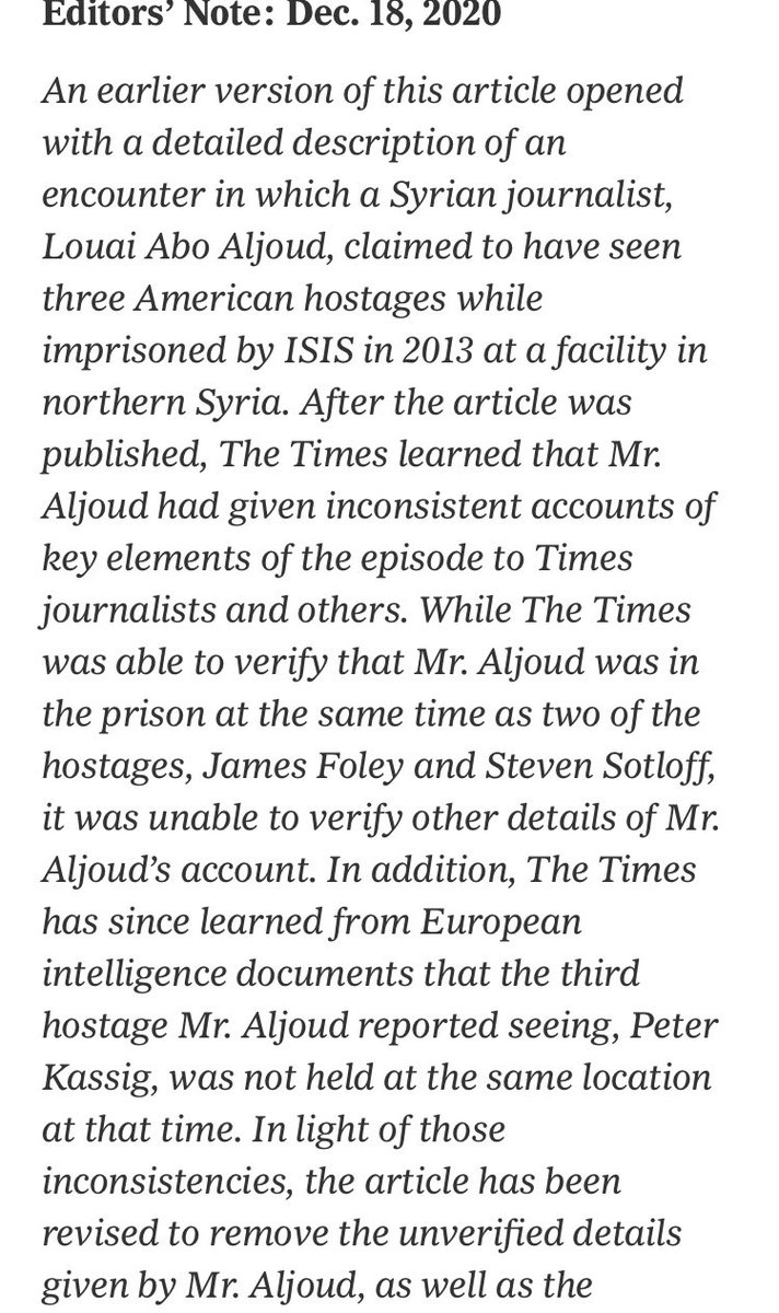 Today we got answers. 1) apparently yes, too big to fail. As per NYT own reporting, other reporters/experts consistently raised concerns abt the reporting going back years. While she will no longer cover terrorism, she remains. The editor’s note maintains she is a “fine reporter”