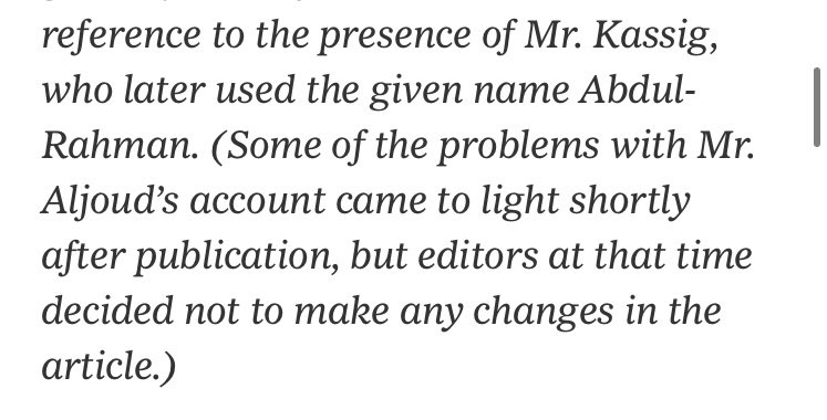 Had a busy day but wanted to circle back to 2 things - 1) NYT line is that there is something abt the audio format that precludes their usual editorial oversight. Huh? Look at this correction snuck today onto this 2014 piece when another fabulist was the main source for a story