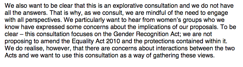 “...this consultation focuses on GRA; we are not proposing to amend Equality Act 2010 and protections contained within it. We do realise, however, that there are concerns about interactions between the two Acts & we want to use this consultation as a way of gathering these views"