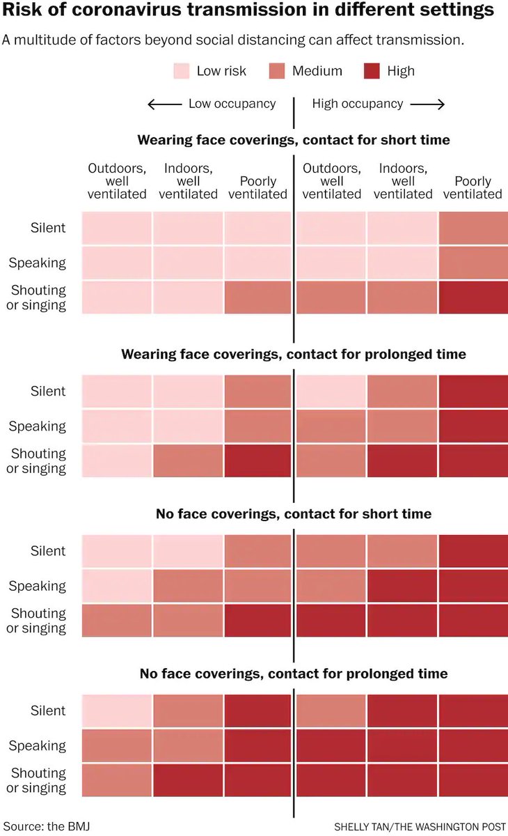 19) Important followup: with ventilation, indoor vs outdoor, speaking volume, mask and contact duration—here is how to piece it together in LOW MEDIUM HIGH risk. It’s not precise but good rule of thumb. HT to @trishgreenhalgh and her team for putting it out.