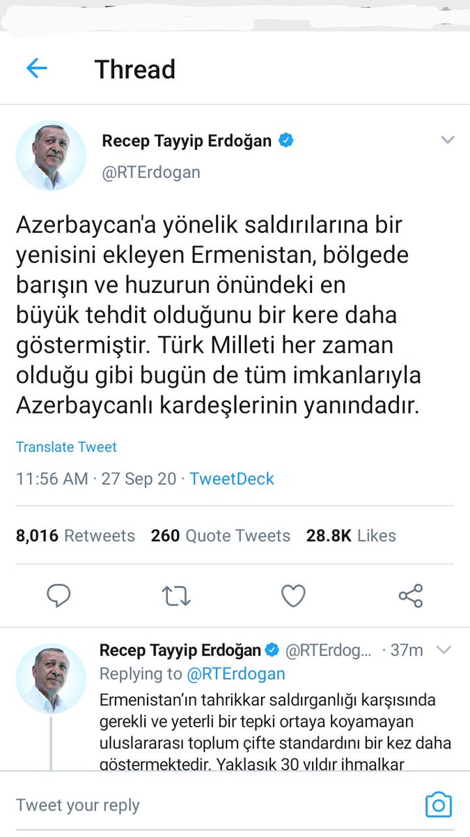 Turkey President Recep Erdogan claims Armenia is a threat. Promises his support for Azerbaijan.