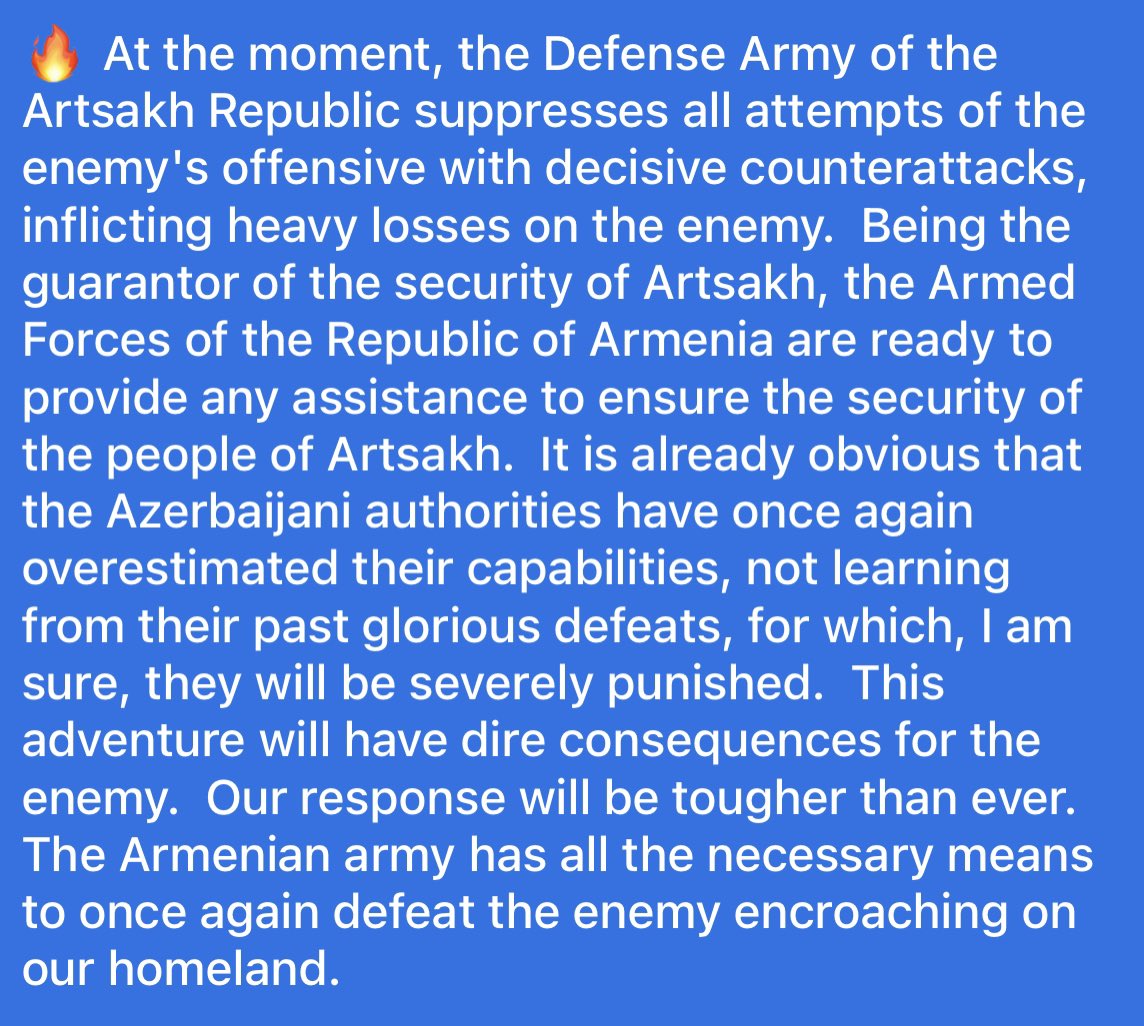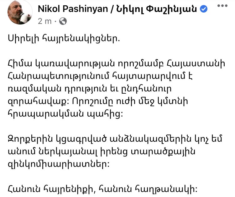 Armenian PM Nikola Pashinyan has just declared martial law and full mobilization in the Republic of Armenia.