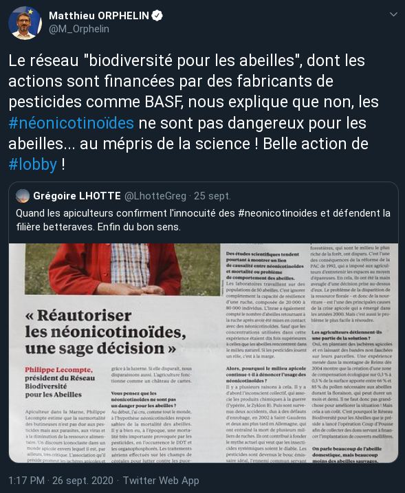C'est exactement ce que fait Matthieu Orphelin en insinuant que les propos de Phillipe Lecompte servent la cause de l'entreprise BASF.