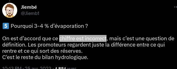 À l’intérieur de la controverse des bassines/réserves de substitution, un argument revient de façon récurrente, c’est le gaspillage d’eau perdu par évaporation. Comme souvent dans ce genre de polémique, on trouve des chiffres assez éloignés entre les promoteurs et les opposants.