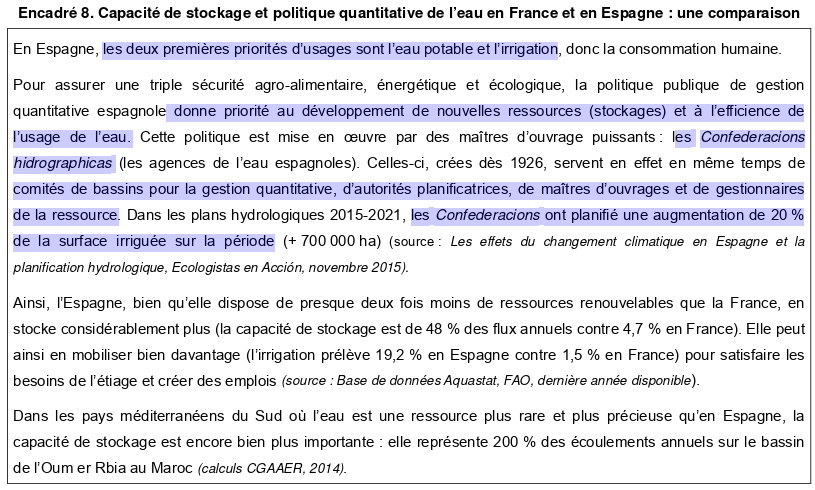 L'Espagne mobilise 19.2% de sa ressource en eau, pour l'irrigation et continu de l'augmenter, contre 1.5% en France.