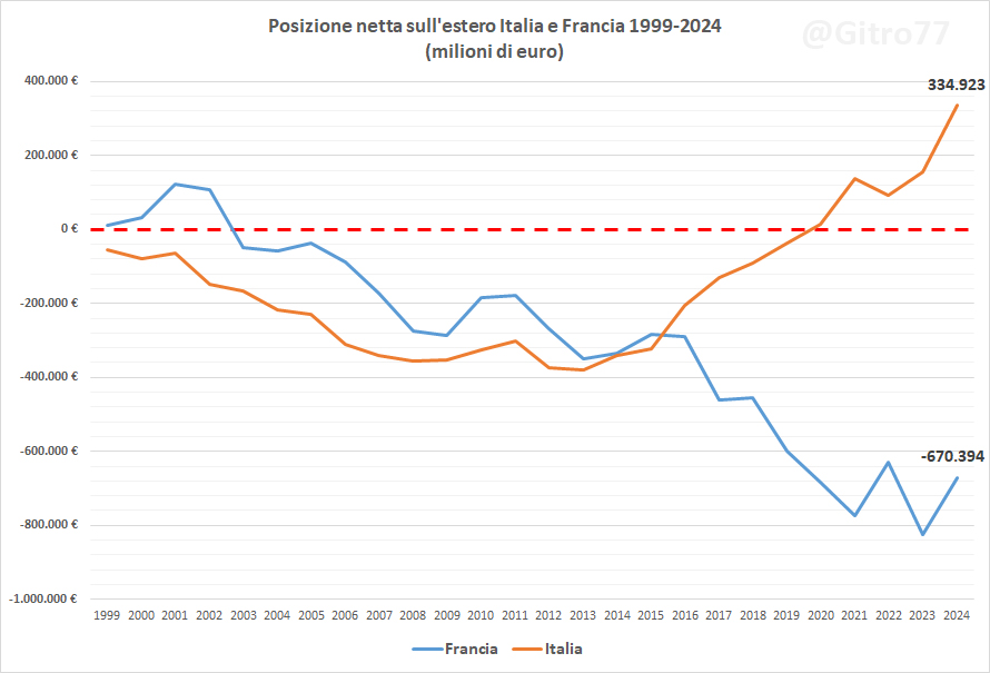 Nel 2011 l’Italia aveva una posizione netta con l’estero negativa per 300 miliardi di euro. Nel 2024 la Francia aveva una NIIP negativa di 670,39 miliardi di euro. Quella dell’Italia è positiva per 335 miliardi (grafico 8).