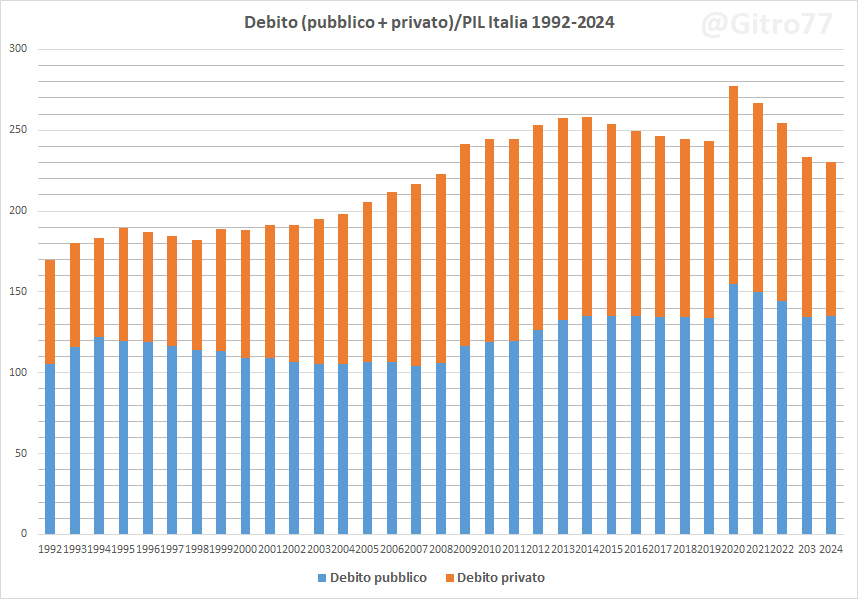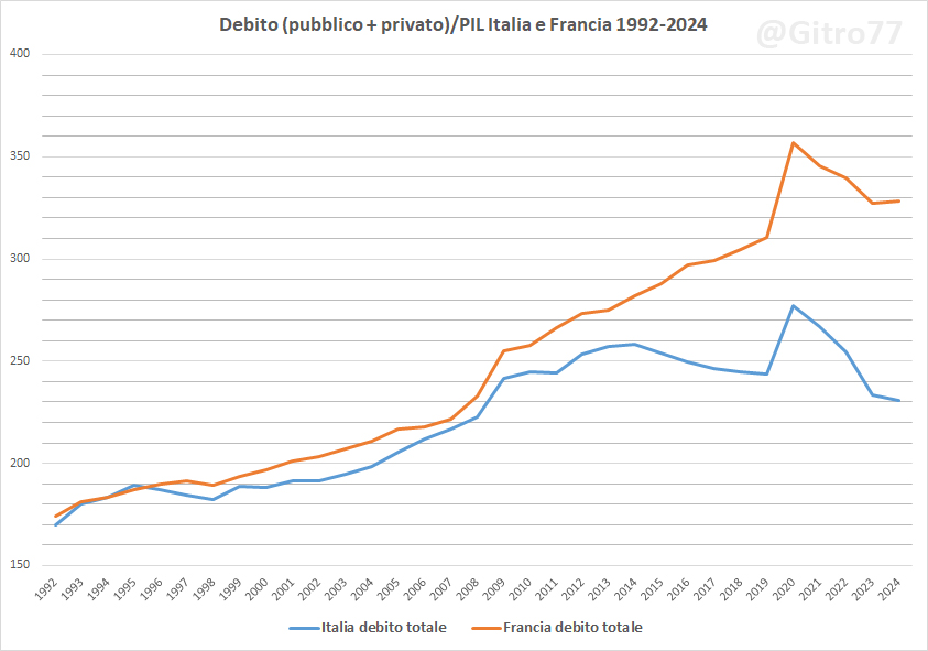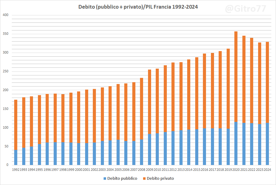 Nel 2011, quando iniziò la "cura Monti", l’Italia aveva un rapporto debito pubblico/PIL del 119% e privato del 125% (per un totale del 244,18%). Nel 2024 la Francia aveva un debito pubblico/PIL al 113,11% e privato al 215,45% per un debito complessivo del 328,56% del PIL (grafici 1, 2 e 3).