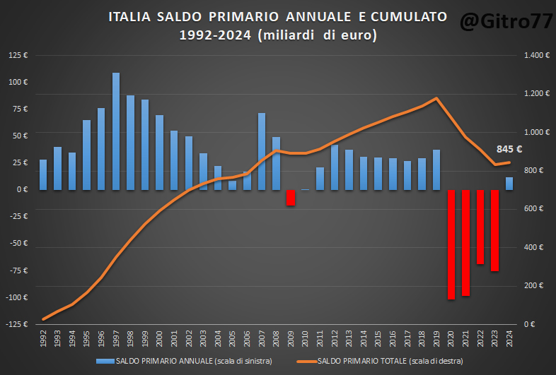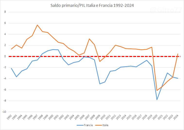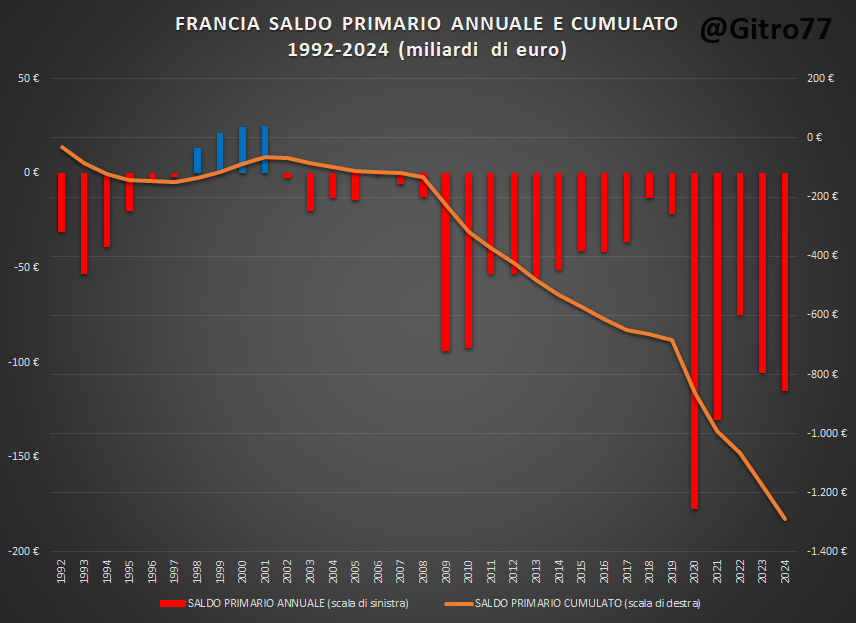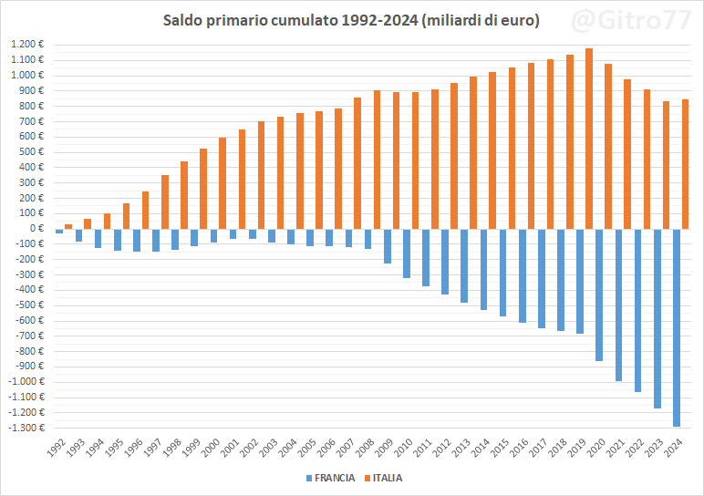 Nel 2011 l’Italia veniva da 18 anni di avanzi primari (cioè di soldi pubblici sottratti all’economia) su 19 (1992-2010) per un saldo totale cumulato di 891,36 miliardi di euro. Oggi la Francia viene da 23 anni di disavanzi primari (cioè di soldi pubblici messi nell’economia) per un saldo cumulato (2002-2024) di 1.222,74 miliardi di euro (grafici 4, 5, 6 e 7).
