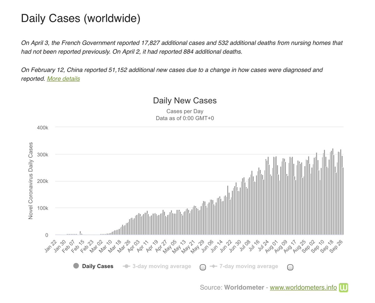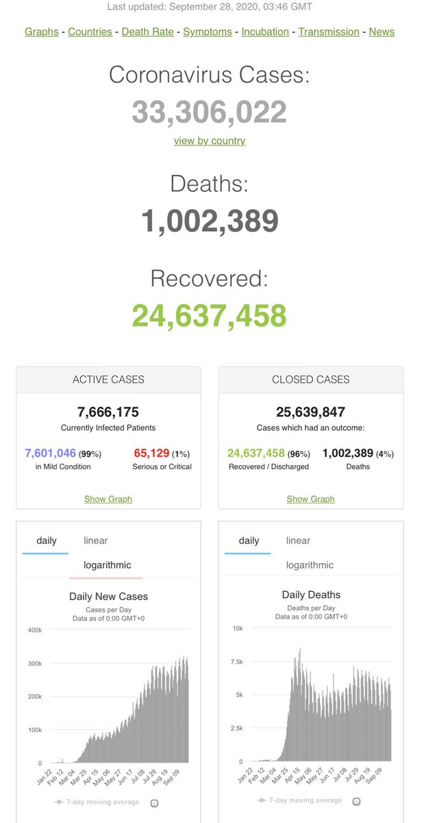 Final #coronavirus numbers for Sept 27th. The world added 251,915 new #COVID19 while losing another 3,873 lives to #COVID. Total to date global virus deaths now exceed 1,000,000 lives lost. With a few exceptions numbers were down yesterday as we enter the Sunday/Monday lull.