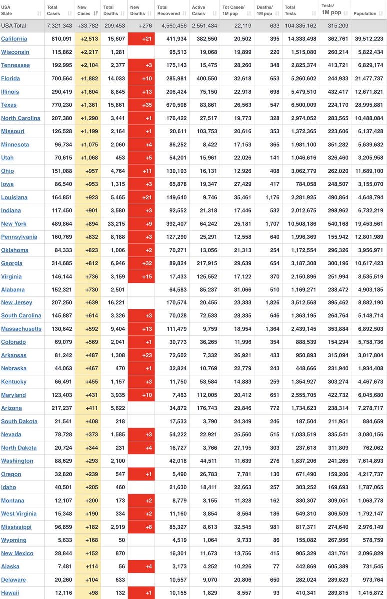 The #USA registered 33,782 new #COVID19 infection cases while another 276 Americans lost their battle with the #coronavirus. The U.S. will pass 210,000 total to date deaths within the next day or two.
