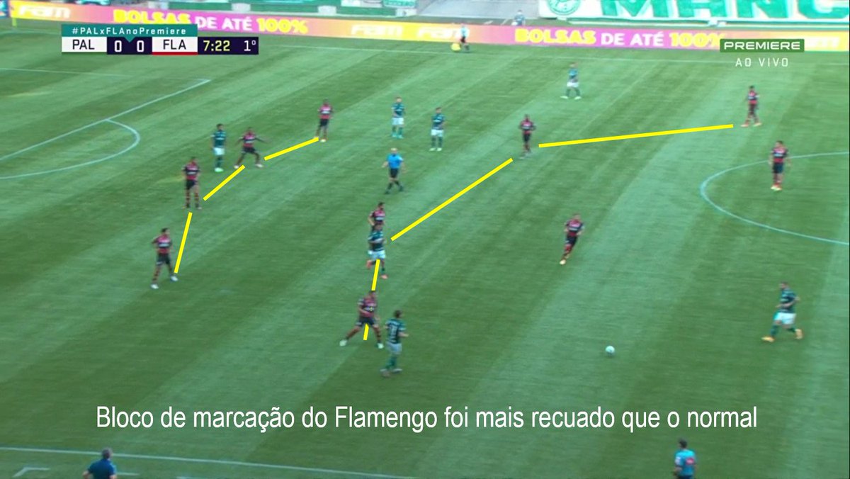 A estratégia do Fla era clara: jogar desde o primeiro minuto com linhas mais baixas que o normal. E por dois motivos: 1) não havia entrosamento para tentar subir uma pressão que muito provavelmente geraria descompactação e 2) contra o Palmeiras a estratégia era perfeita.