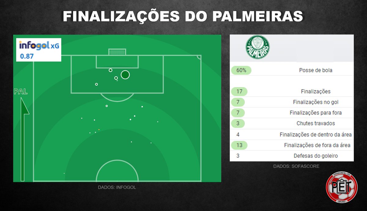 13 das 17 finalizações do Palmeiras foram de fora da área. 76% dos chutes foram desferidos de mais de 20 m de distância da baliza. Isso mostra o tamanho da falta de criatividade do time paulista.
