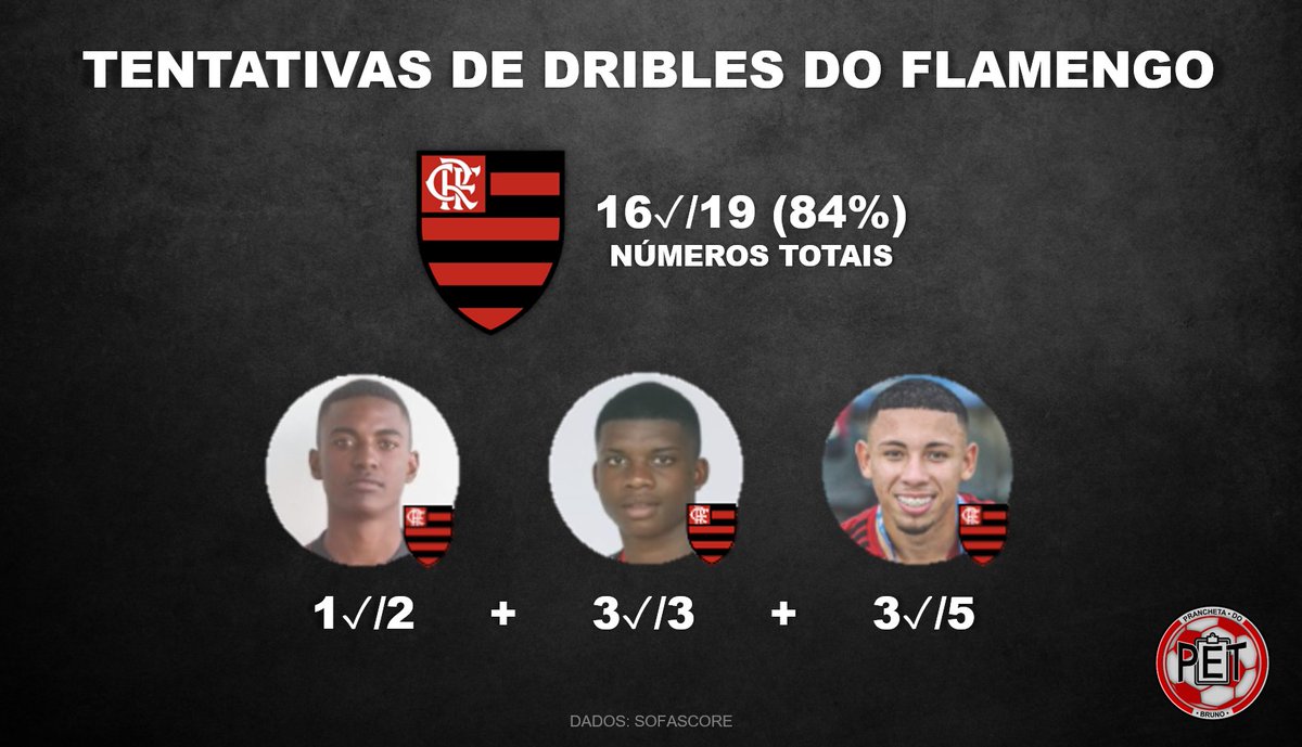 Com o Palmeiras sem conseguir se impor na partida, vimos a garotada do Flamengo cheia de personalidade. Foram 16 dribles certos em 19 tentados, sendo mais da metade realizados por Guilherme Bala (5), Lincoln (3) e Ramon (2).